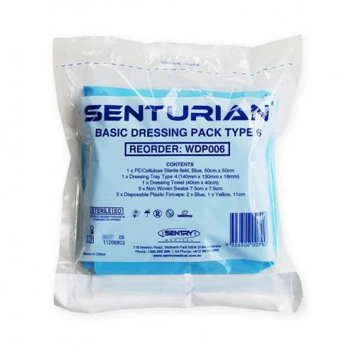 Pack contains: 3 disposable forceps, 5 gauze swabs, dressing tray, paper towel, and plastic work sheet